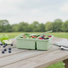 مصمم بشكل خاص ويتكون من قسمين، كما يحتوي على غطاء وملعقة وشوكة وطبق صغير جداً يمكن استخدامه للصلصة.