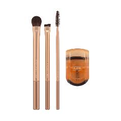 Set includes an eyeshadow brush, eyeliner brush, eyebrow brush, and eyelash curler. Ideal for applying eyeshadow, defining, and shaping eyebrows.