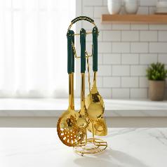 Ceramic and steel kitchen utensil set, suitable as a gift and will enhance the elegance of your kitchen in an excellent way. It is also very important for cooking and helps you cook your favorite dishes. Goldin and Turquoise color.