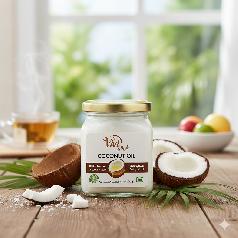 زيت جوز هند طبيعي تماماً، صالح للطبخ وللاستخدام على الشعر والبشرة أيضاً.