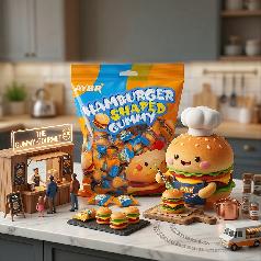 جيلي الهمبرغر يتميز بطعم حلو ومظهر فريد وملون، وهو مليء بالنكهة. The hamburger-shaped jelly has a sweet taste, a unique and colorful appearance, and is full of flavor.