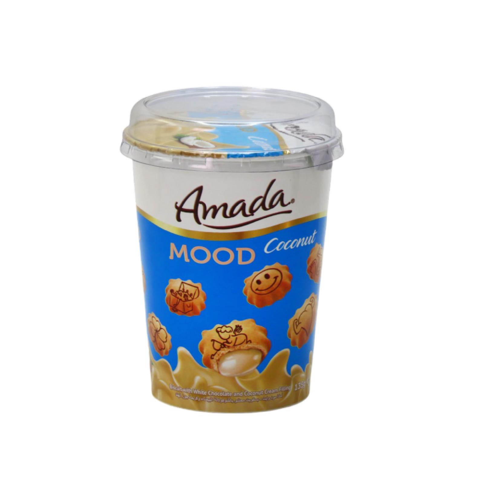 البسكويت دائري وحبّات، محشو بكريمة الشوكولاتة البيضاء وجوز الهند.