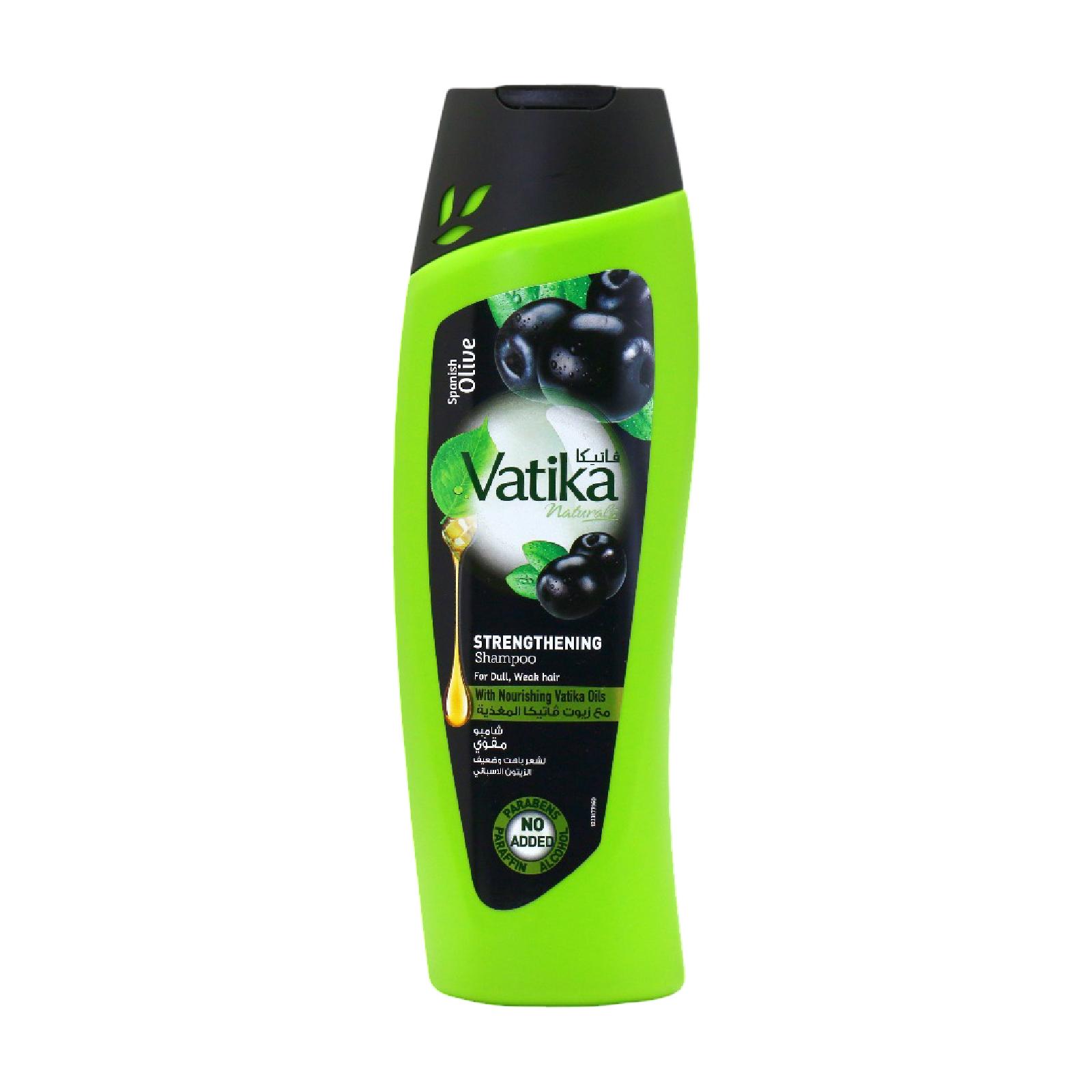 Hair strengthening shampoo for dull and weak hair with Spanish black olive extract and nourishing Vatika oils.