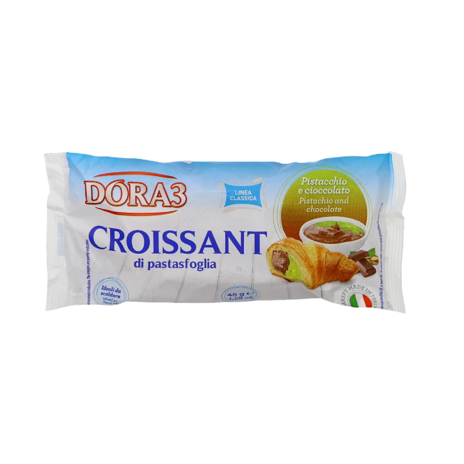كرواسون شوكولاتة وفستق طري وهش، محشو بنصف كريمة شوكولاتة ونصف كريمة فستق، في مزيج لذيذ ومميز مناسب للفطور أو كتحلية خفيفة مع القهوة.