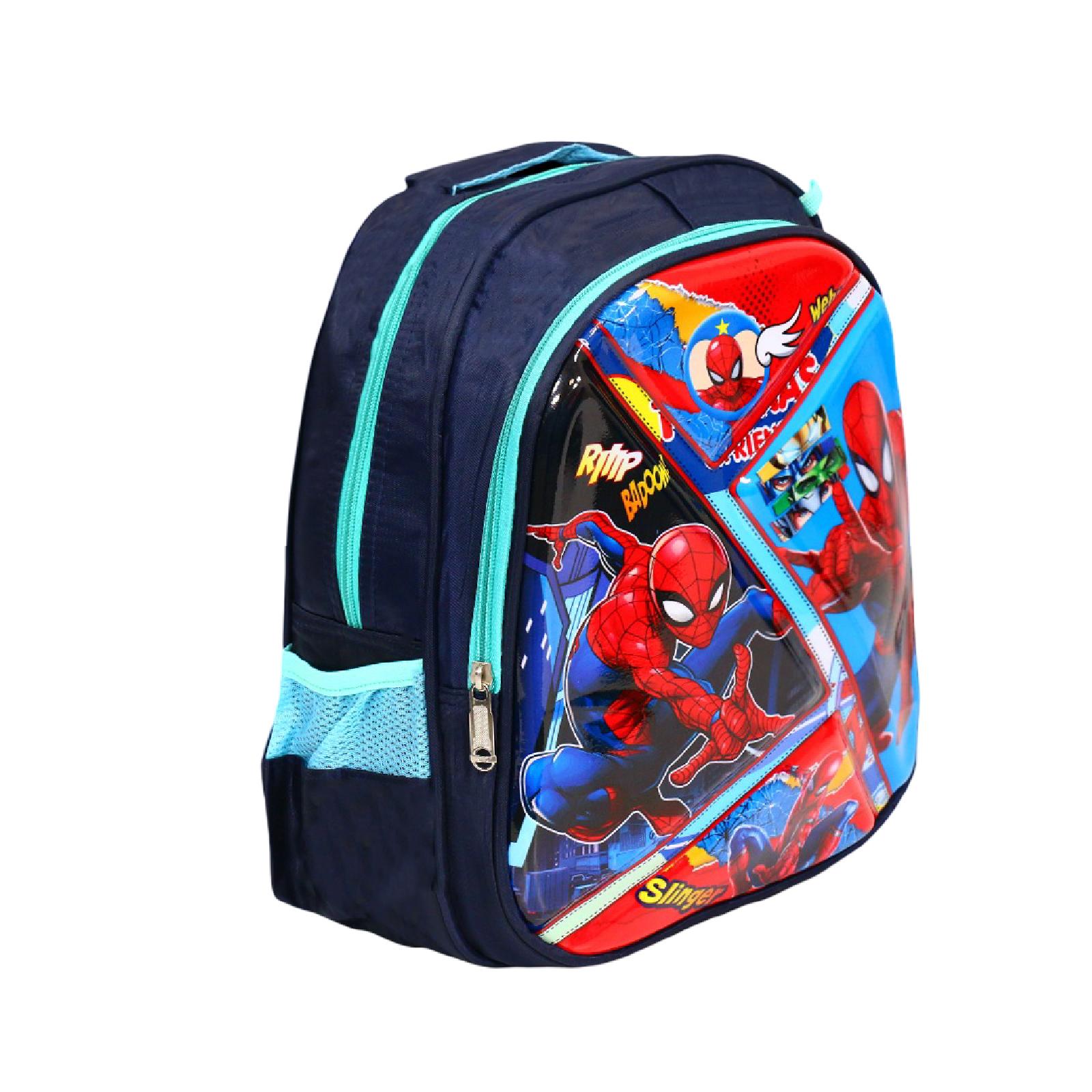 حقيبة مدرسة جميلة جدا على شكل سبايدر مان ومميزة فهي مكونة من قطعتين حقيبة كبير ذو خانتين مع محفظة اقلام وجيوب جانبية لوضع الماء .