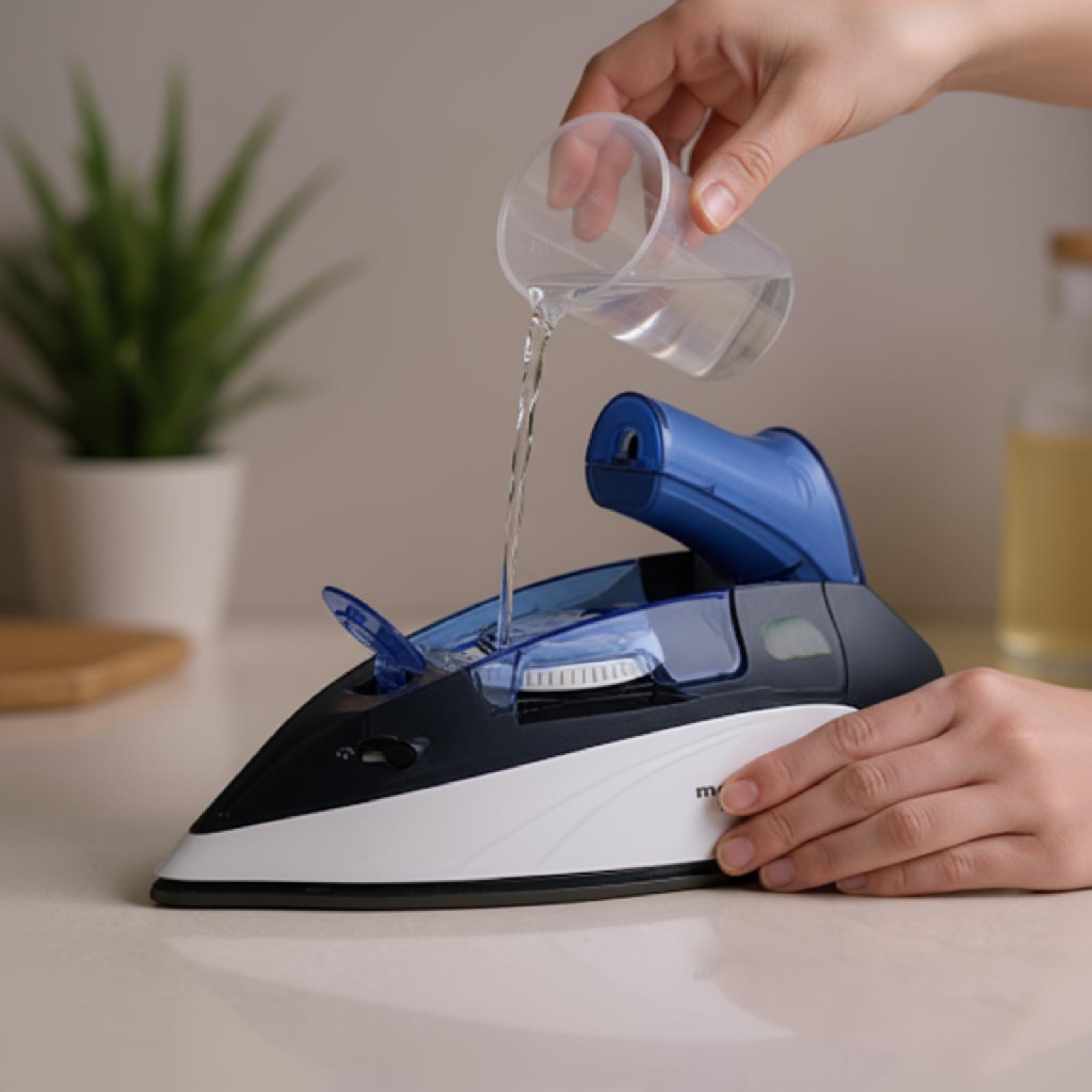 مكواة صغيرة الحجم ومناسبة جداً لأوقات السفر، بسبب صغر حجمها، لها مقبض سهل الحمل والكي.