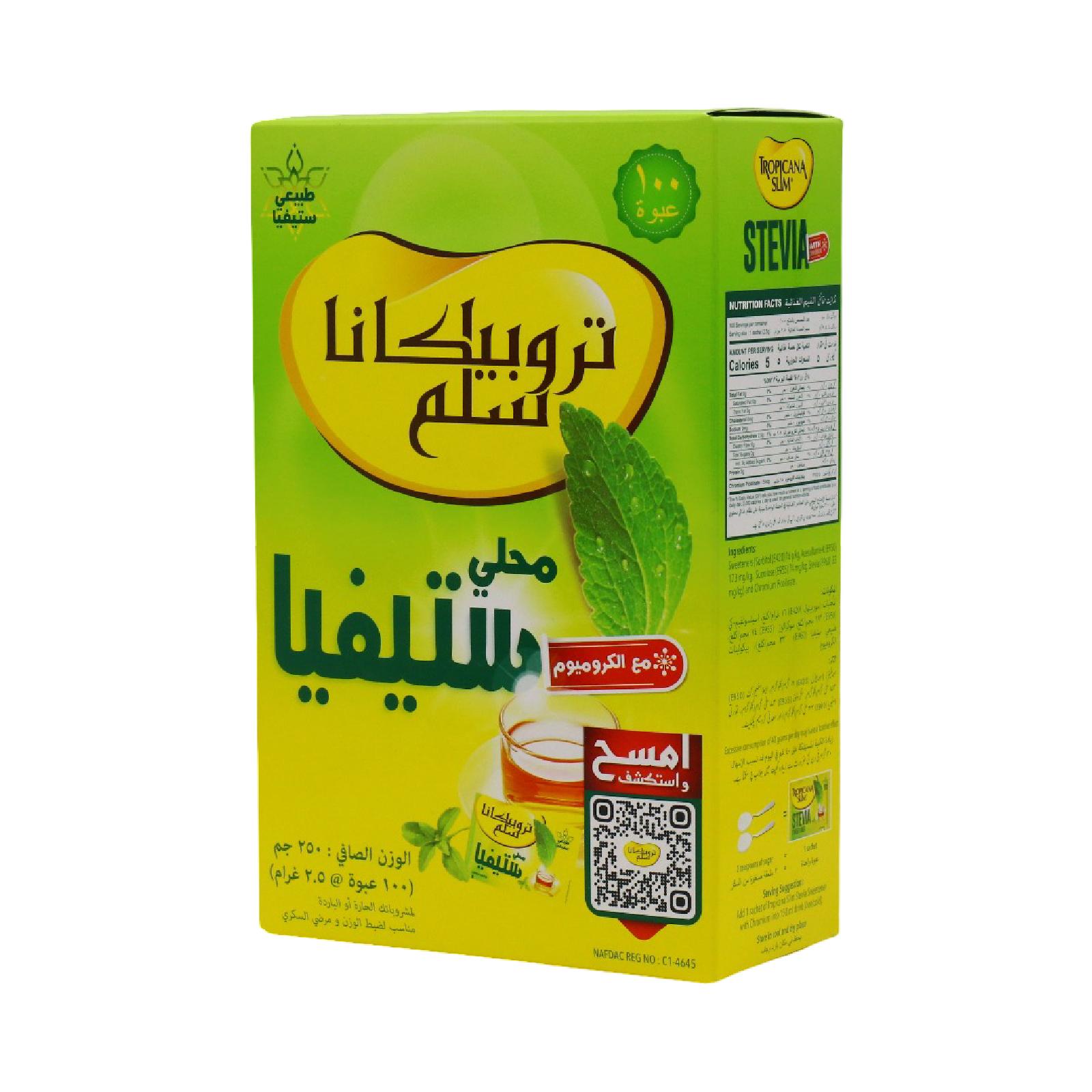 Stevia Slim Sweetener is made from the extract of the Stevia plant leaves as a natural sweetener used by diabetics and dieters due to its low calories and benefits. It is suitable for hot and cold drinks and making sweetsIt is sugar free and sweet in taste.