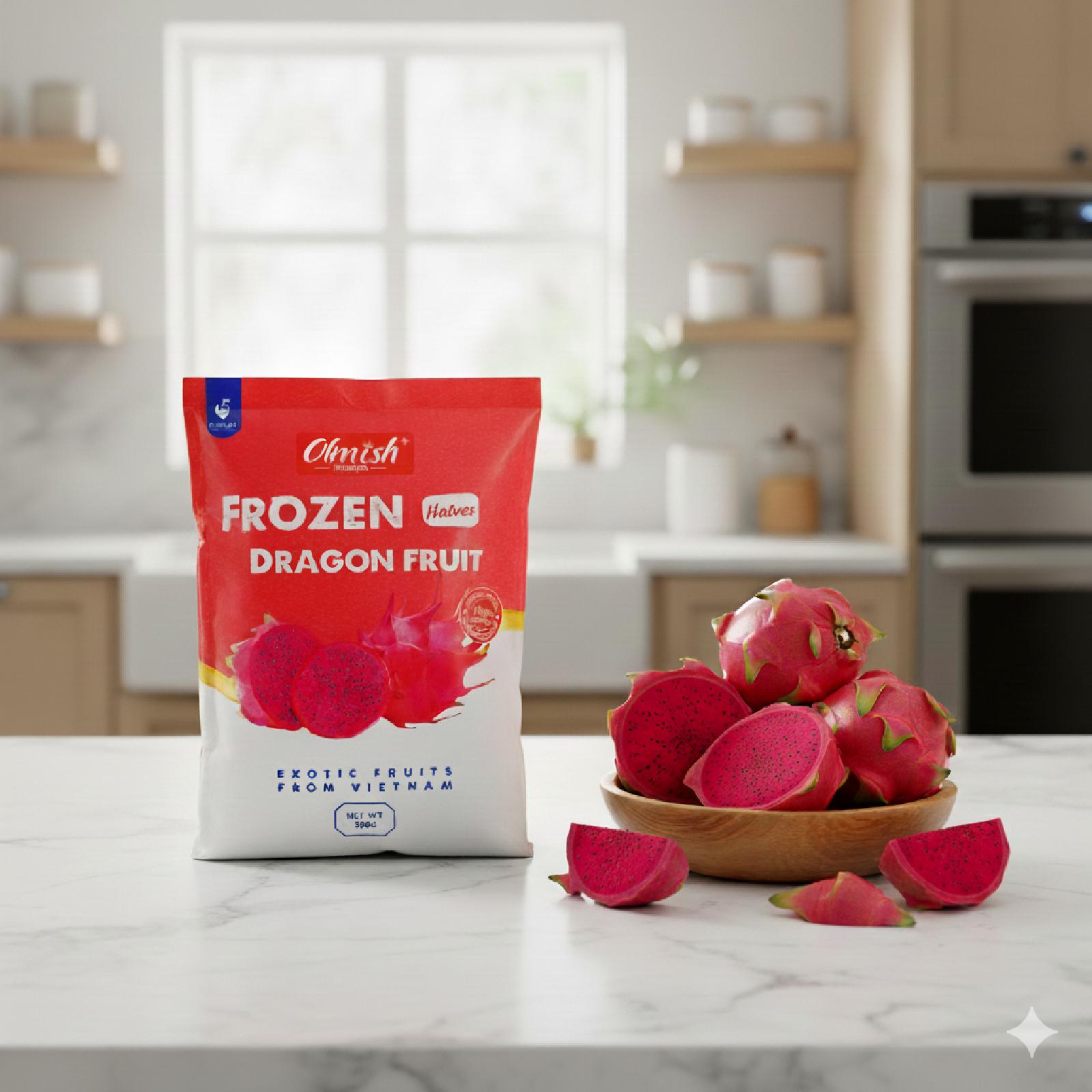 فاكهة التنين الاحمر المجمدة فاكهة حلوة المذاق مثالية للاستخدام في العصائر والسموذي والحلويات والفطائر.