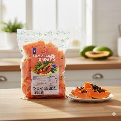قطع شهية من فاكهة البابايا الطازجة، تم تجميدها بسرعة للحفاظ على نكهتها الحلوة وقيمتها الغذائية لونها البرتقالي الزاهي وطراوتها تجعلها مثالية للعصائر، السموذي، الحلويات أو حتى كوجبة خفيفة باردة ومنعشة.