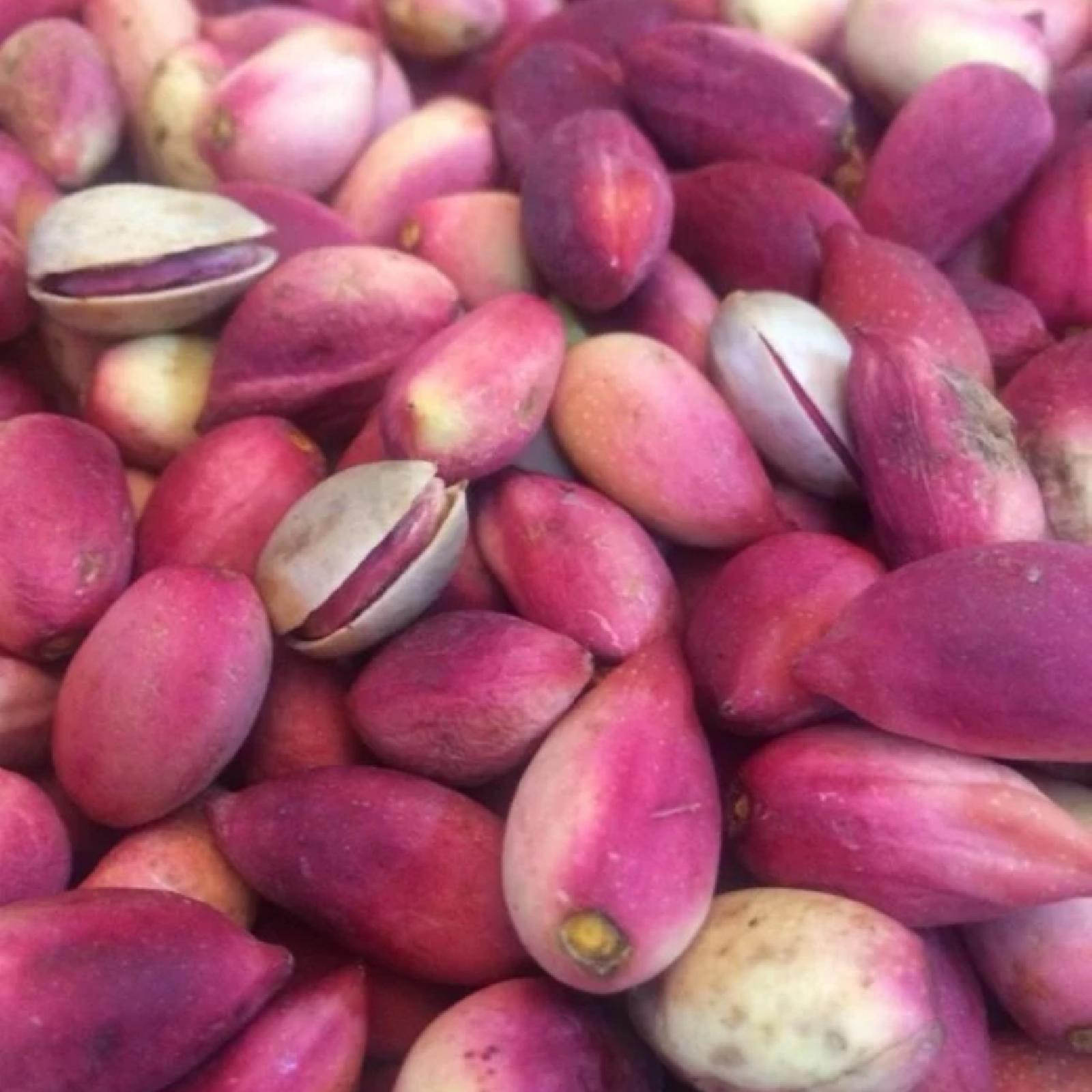 فستق خام بقشرته الداخلية الورديه قريبة إلى الأرجواني ومن الداخل يميل لونه إلى الأصفر قليلاً لذيذ الطعم ويعتبر وجبة خفيفة يؤكل كنوع من المكسرات وأقل رطوبة من فستق العادي له العديد من الفوائد الصحية.