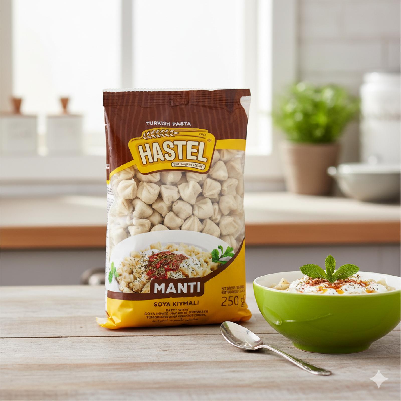مانتي بلحم الصويا المفروم طبق تركي تقليدي شهير لذيذ وممتع جاهز فقط قم بسلقه لدقائق ثن تناوله مع اللبن والبابريكا .