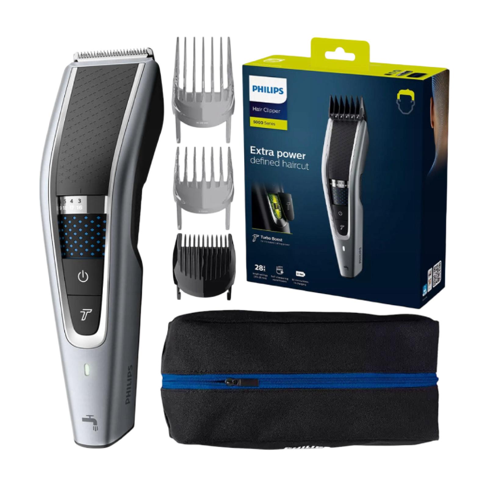 ماكينة حلاقة والتي تتميز بامكانية استخدامها عن طريق توصيل المقبس بالكهرباء او استخدام البطاريات القابلة لاعادة الشحن مع مشطان قابلان للتعديل و التصغير من 3 إلى 28.