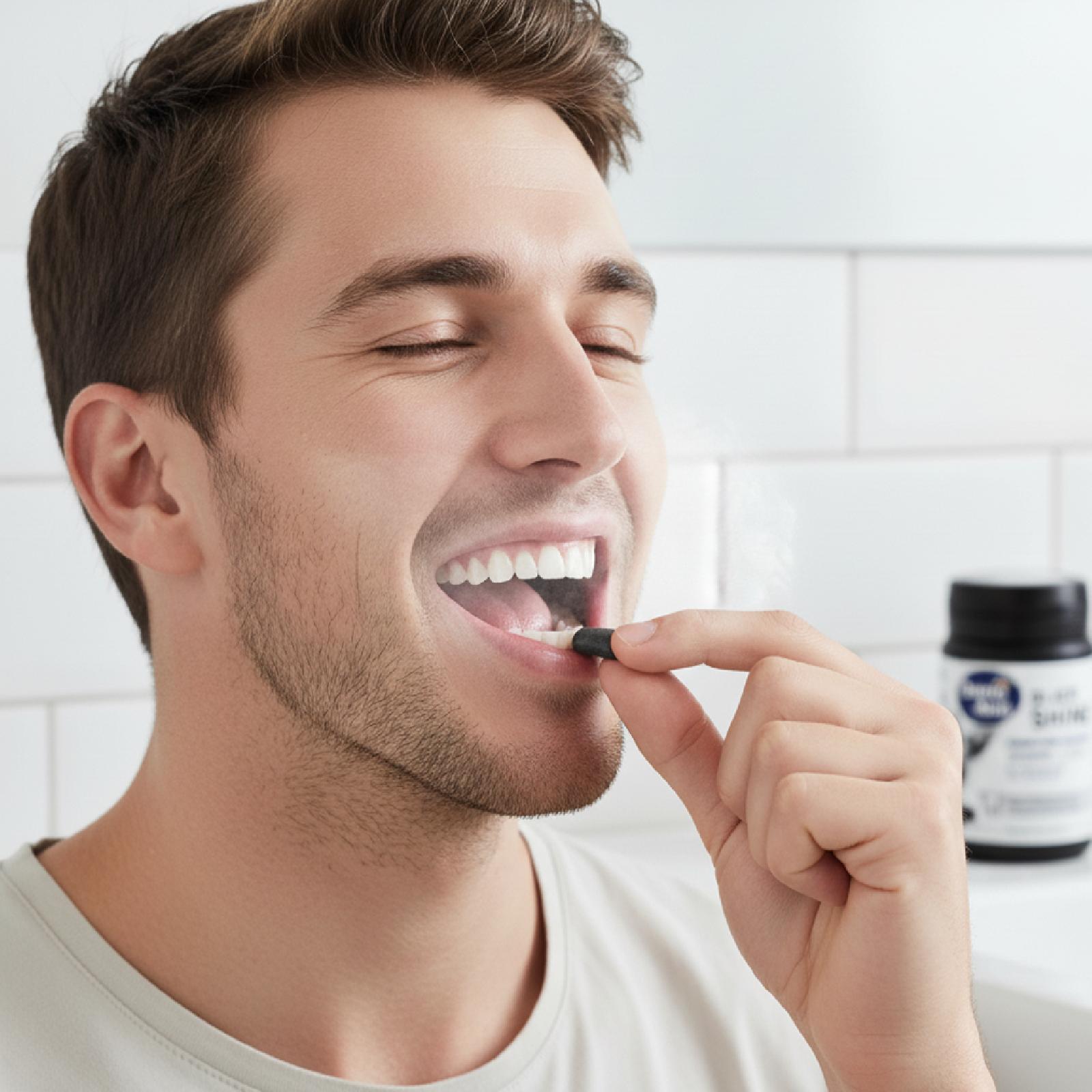 Delicious and unique sugar-free mint-flavored gum, gluten-free, with activated charcoal, ideal for fresh breath.