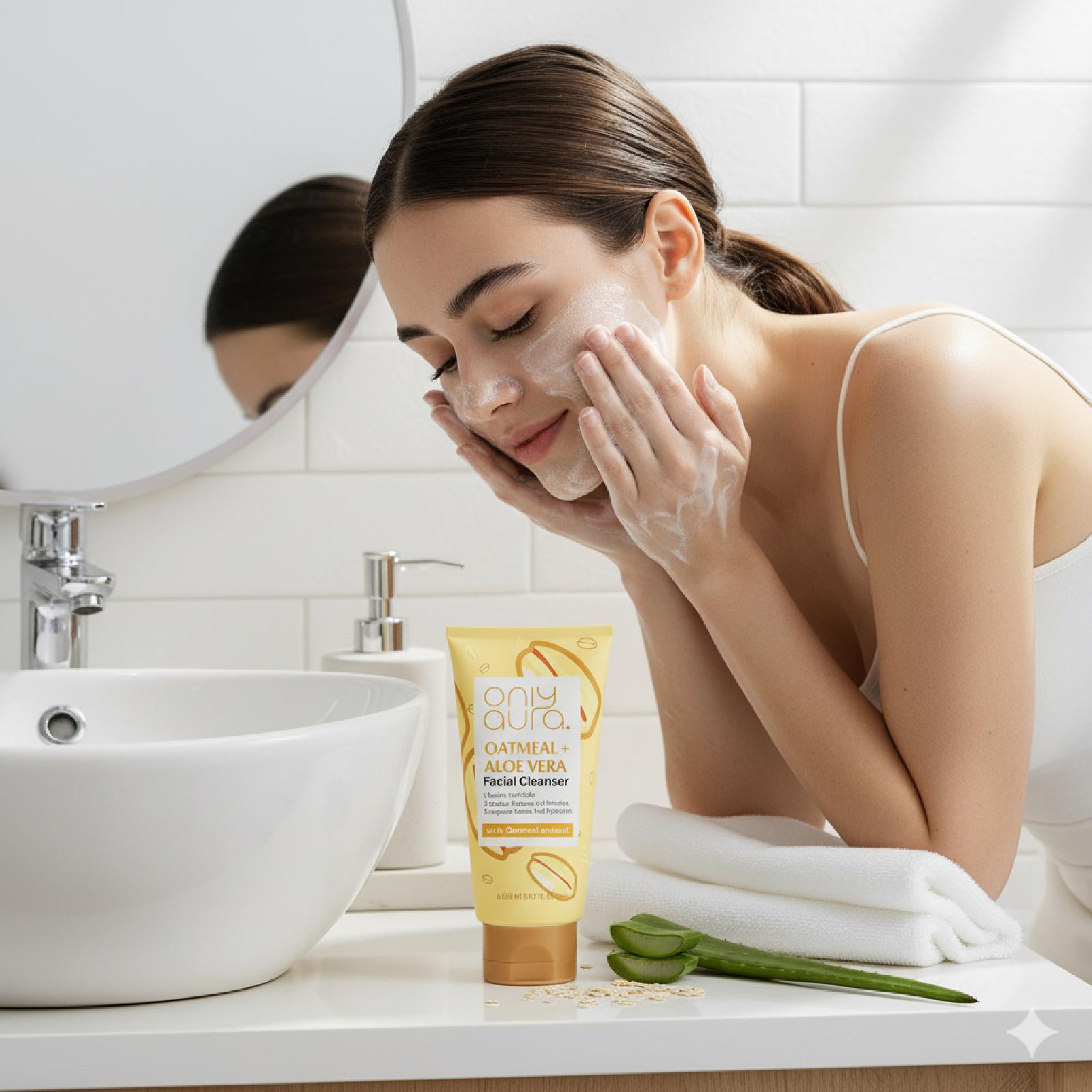 منظف الوجه بالشوفان والصبار يُهدئ البشرة، ويُقلل الاحمرار والتهيج، ويُحسّن ملمسها وترطيبها.