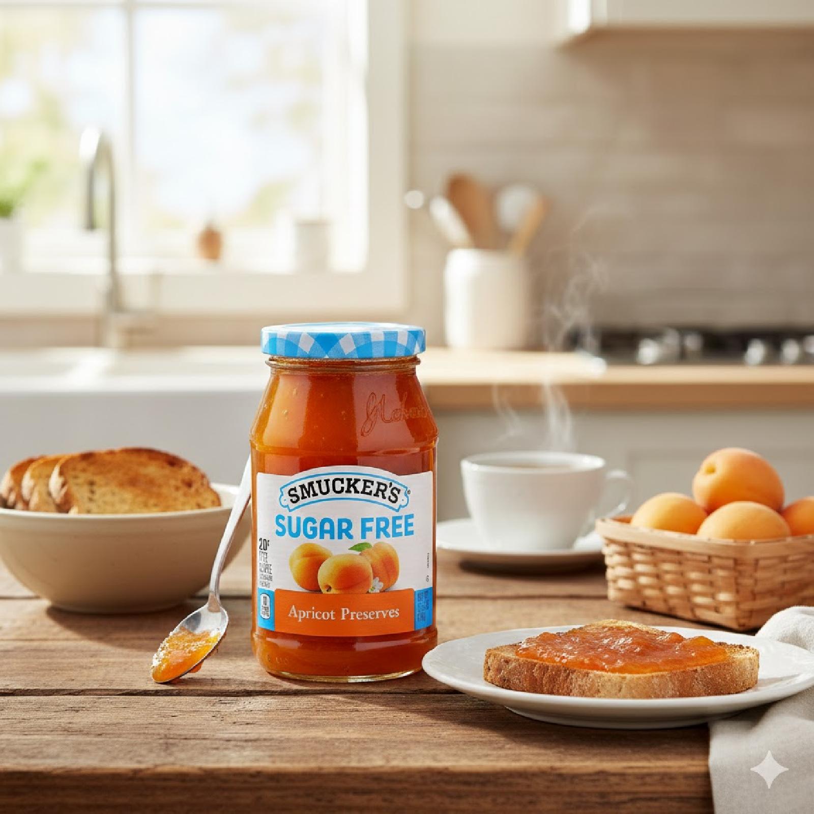 Sugar-free apricot jam with a delicious, naturally fruity flavor, made from ripe apricots that are gently cooked to retain their rich taste and pleasant aroma.
