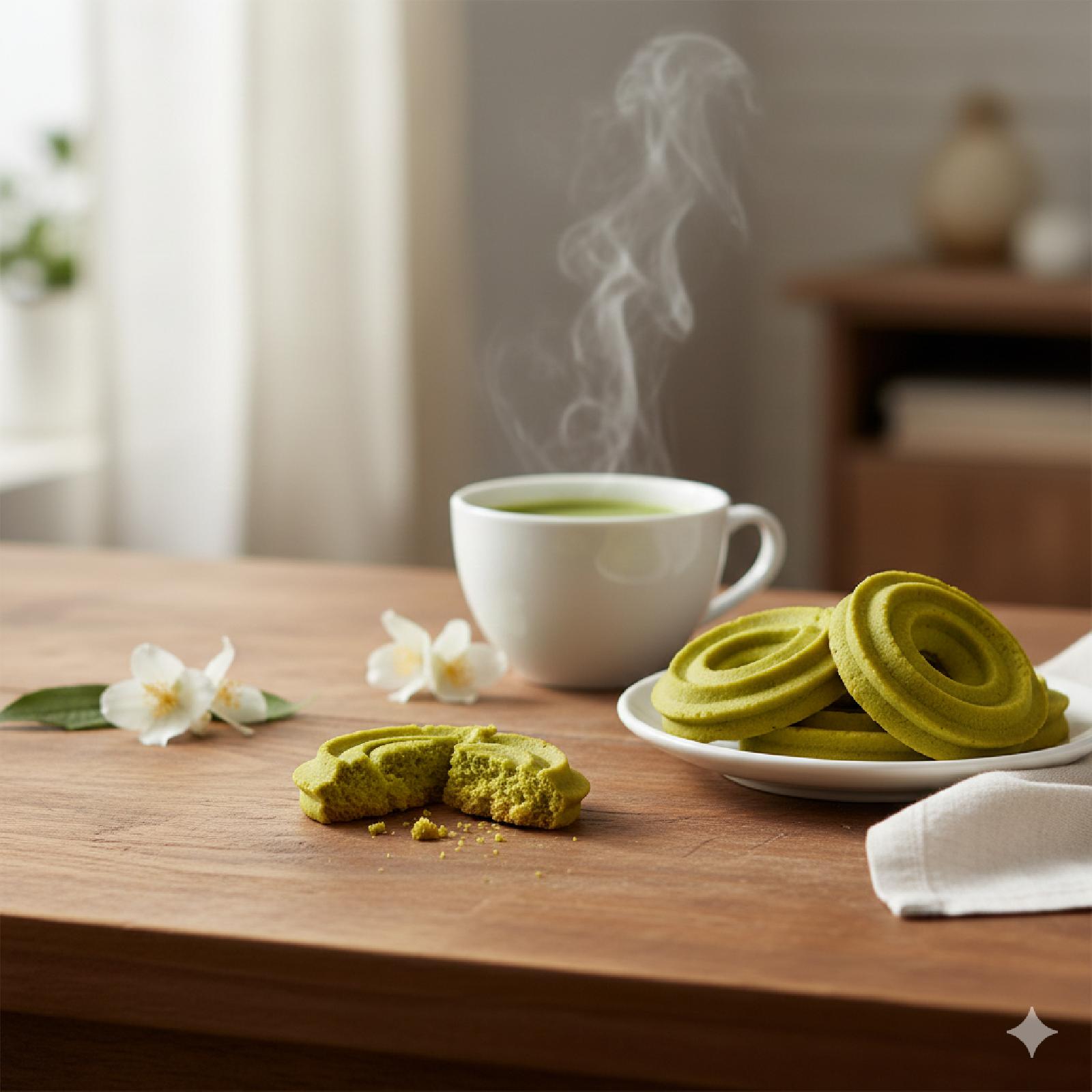 ئەم پسکویتە تێکەڵەیەکی ناوازەیە لە تامی یاسمین و ماتچا.
