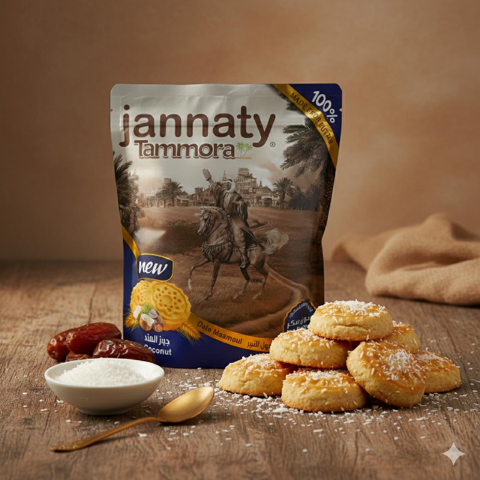 Jannaty Premium Maamoul with dates and coconut, for lovers of authenticity and healthy taste, It features a 100% natural flavor with no added sugar, making it ideal for diabetics and those following a healthy diet.
