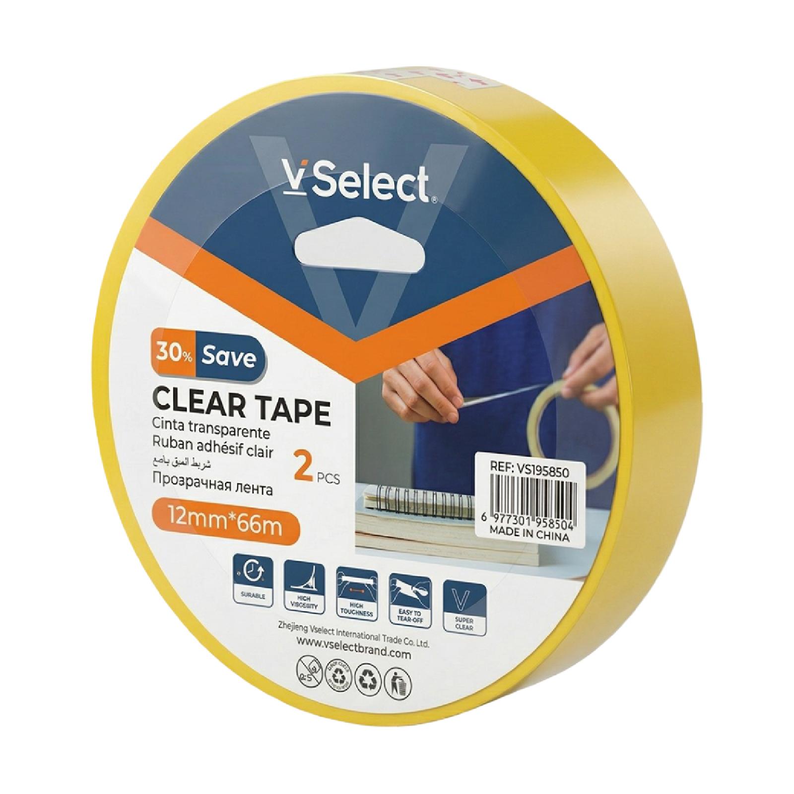 A two-piece pack of transparent adhesive tape, each with a width of 12mm (approximately half an inch) and a length of 66 meters. Due to its thinness and transparency, it is highly suitable for gift wrapping, repairing torn paper, or sealing small boxes and envelopes in a way that does not obscure the underlying color.