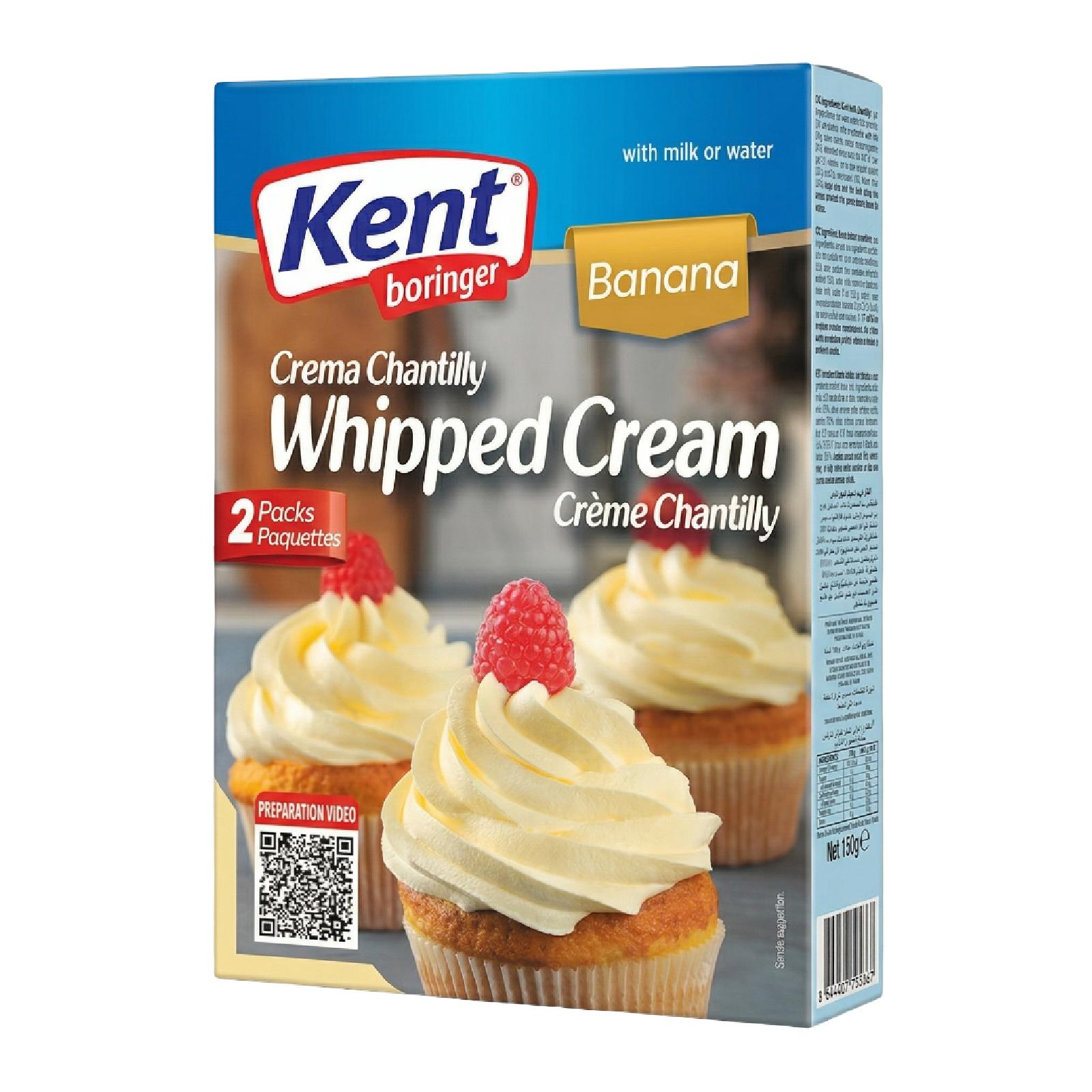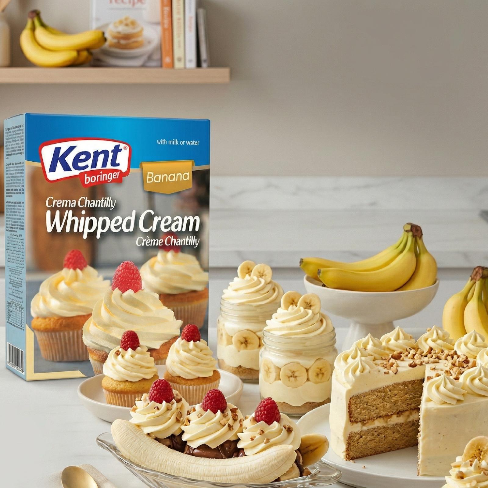 Banana Flavored Whipped Cream Used for cake decoration, frosting,and filling various types of cakes and pastries It can also be used as a topping for ice cream, When mixed with cold milk or water it transforms into a light and thick cream that gives a beautiful finish to your desserts.