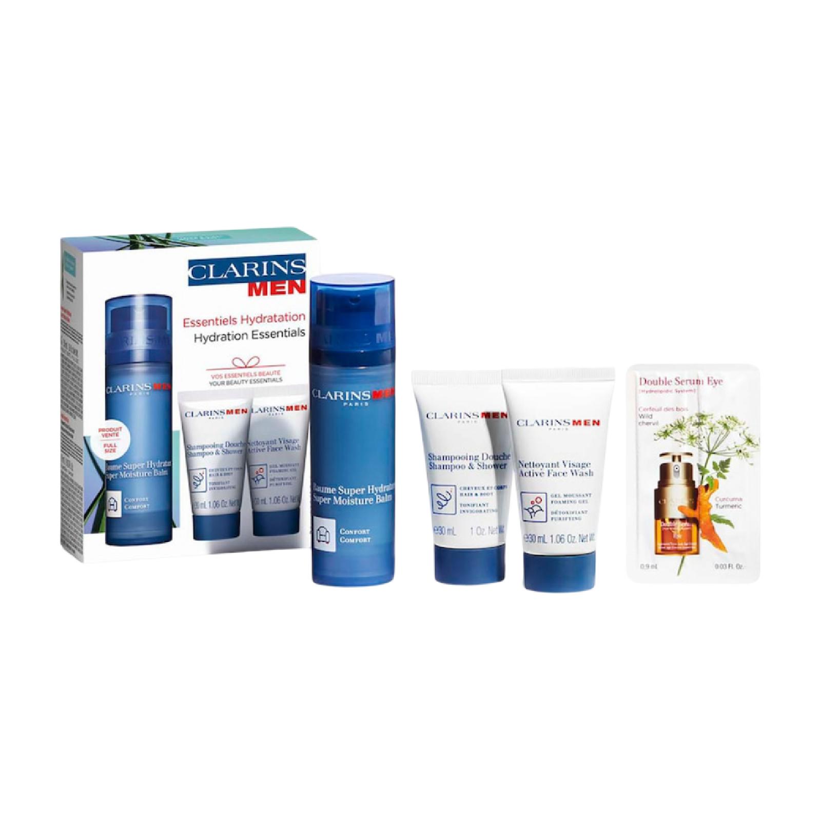 The Clarins Moisturizing Set is carefully selected to provide essential hydration and care for men's skin. It contains a 50ml face balm, a 30ml face wash, and a 30ml shower gel.