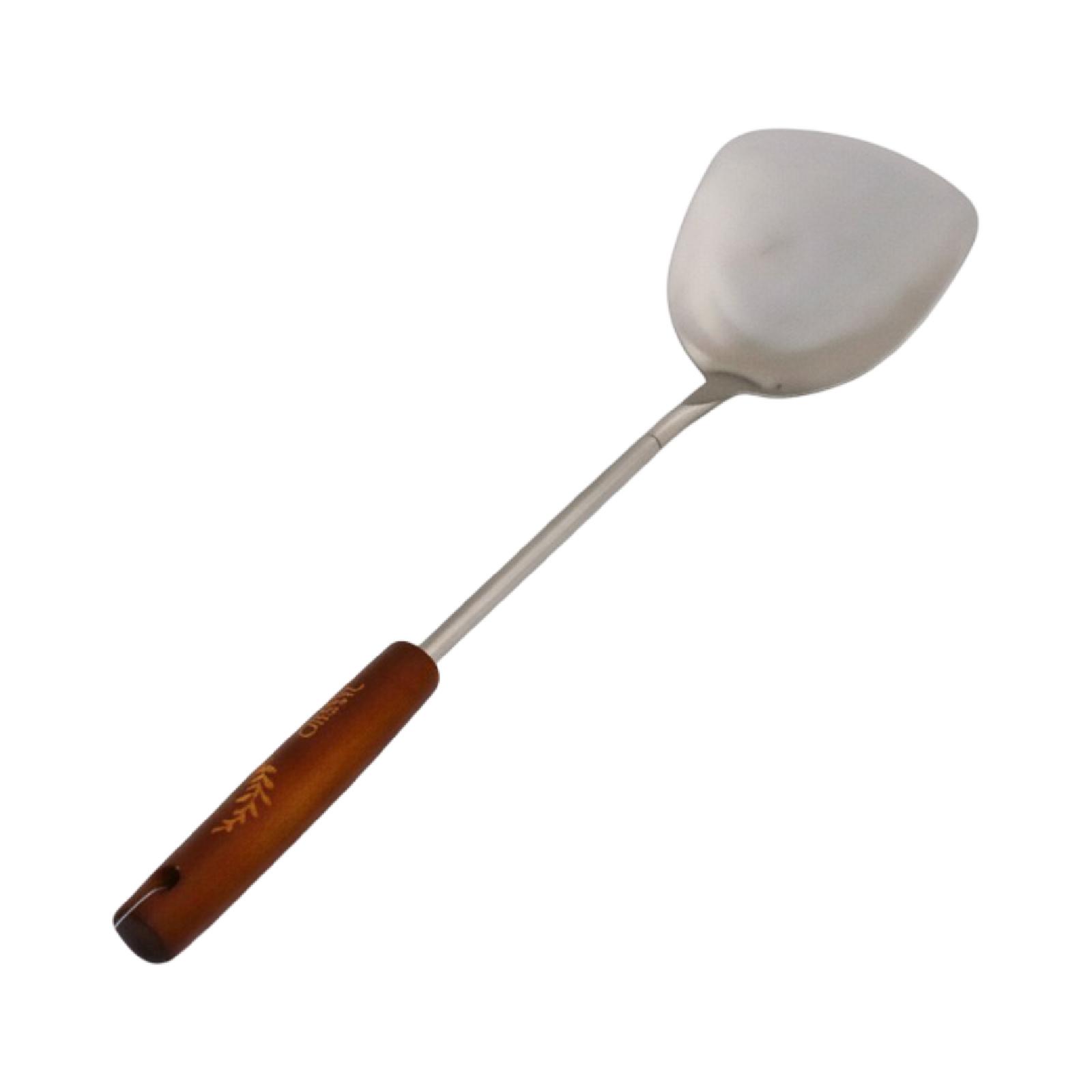 An iron turner with a wooden handle that you can use to stir food and scoop it onto plates.