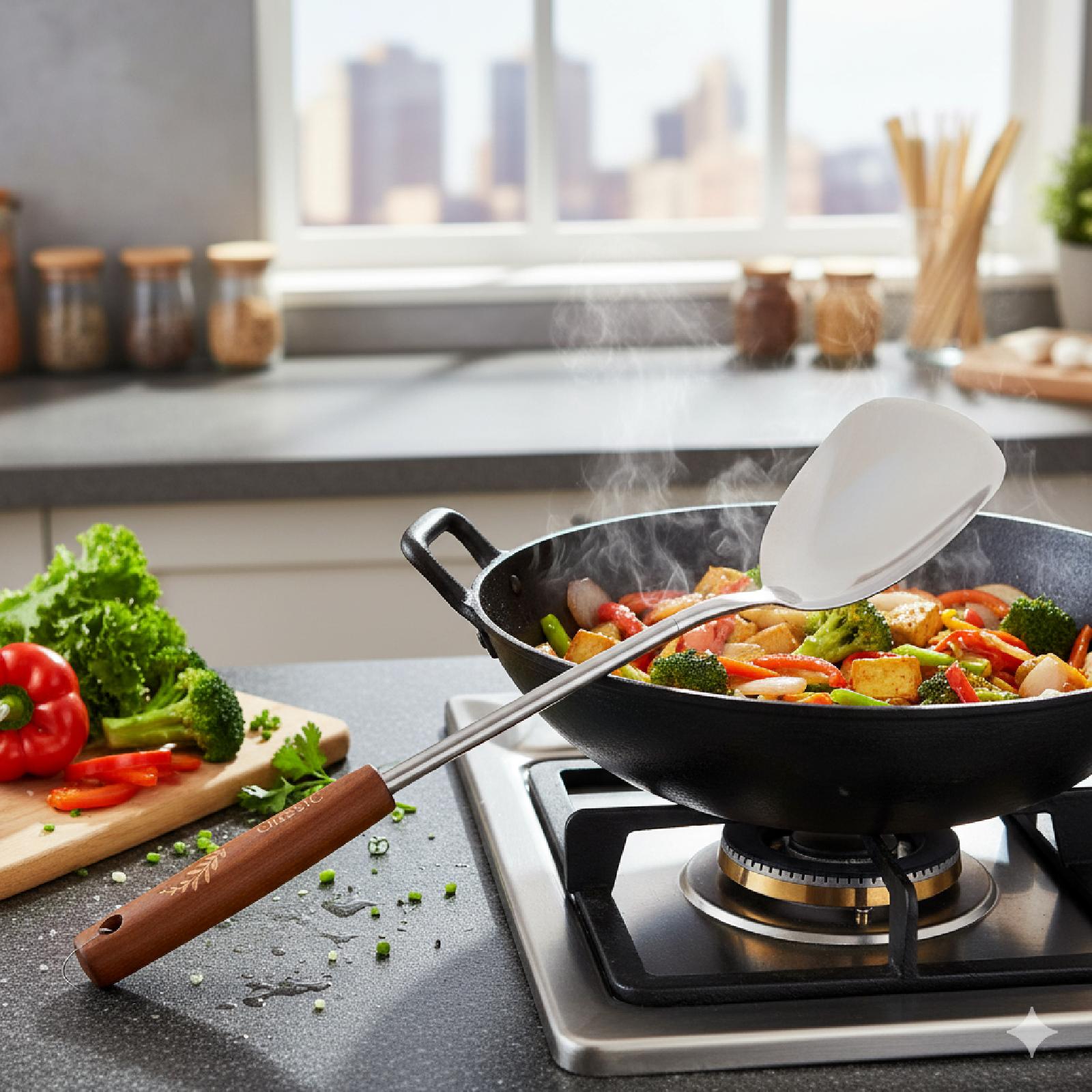 كفكير حديد مع مقبض خشبي يمكنك استخدامه في تقليب الطعام وغرفه في الصحون .