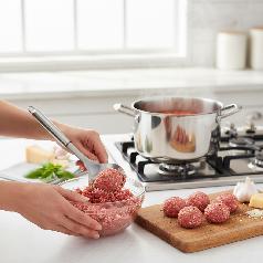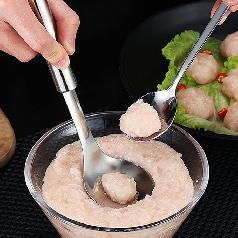 A unique and multi-purpose spoon with a hole inside that you can use to scoop pasta or meatballs or to form meatballs using the hole inside.
